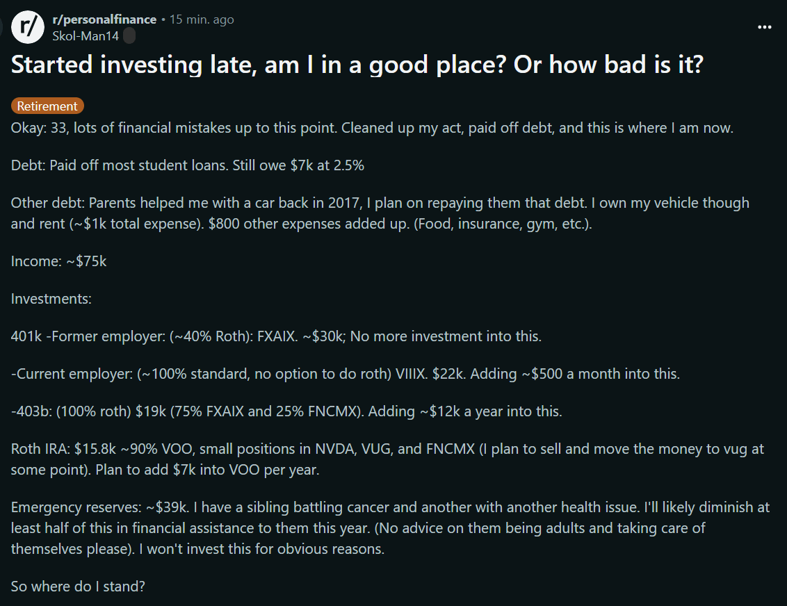 This person has about $86k across retirement accounts, and is adding roughly $25k per year. That’s an aggressive savings rate on $75k income, and very impressive.