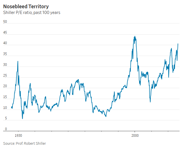 Or the stock market: The Shiller Price-to-Earnings ratio, which uses inflation-adjusted average returns to cover an entire business cycle, is now at levels not seen since the height of the dot-com bubble in 2000: